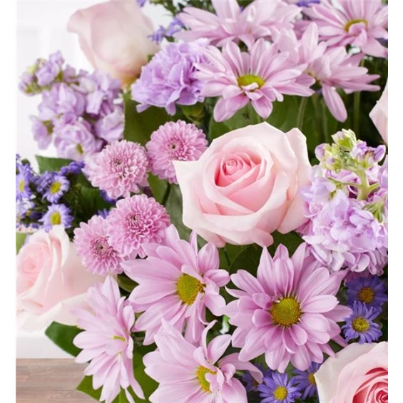 EXCLUSIVE Just like a daydream. Our delightful lavender bouquet is gathered with accents of pink and lush greenery in a glass vase tied with a lavender satin ribbon that complements the delicate beauty of the blooms.